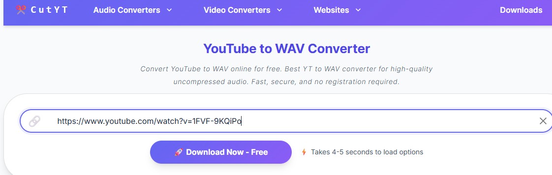 CutYT is a clean, ad-free downloader that allows you to get high-quality WAV files from YouTube with no registration required. It offers fast download speeds and additional features that let you trim audio before downloading, keeping only the parts you want.